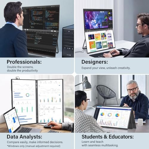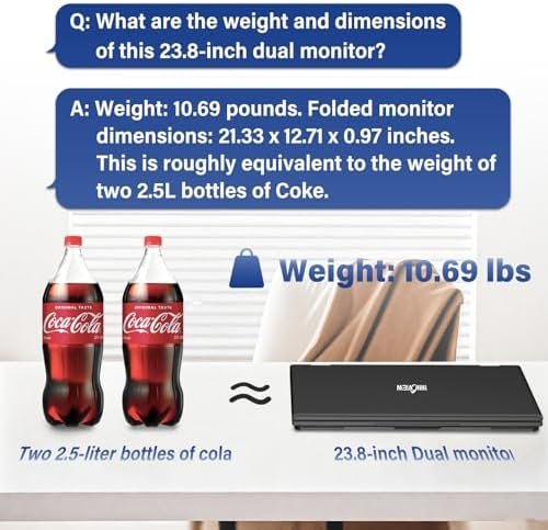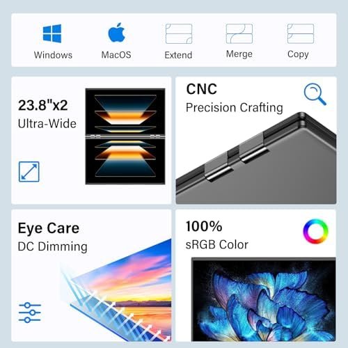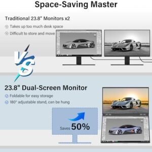 About this item 【Dual-Screen Flexibility vs. Traditional Large Monitors】 This 23.8-inch dual-screen monitor offers more screen real estate while saving desk space compared to traditional large single-screen monitors. Perfect for multitasking, work, study, and creative projects, you can view multiple apps and documents at once without cluttering your workspace.Note:Please make sure you’re powering the monitor by the original power adapter we provided in the package. 【Vibrant Colors & Smooth Performance with 100% sRGB and 100Hz Refresh Rate】 With 100% sRGB color coverage, this monitor delivers vibrant, true-to-life colors, making it ideal for graphic design, photo/video editing, and creative tasks. The 100Hz refresh rate ensures smooth performance, reducing motion blur for a better experience during gaming, fast tasks, or video editing. 【Effortless Plug-and-Play Compatibility】 No drivers are needed—just plug and play. Compatible with both macOS and Windows systems, it supports three display modes: duplicate, extend, and splice. This versatility makes it perfect for meetings, presentations, or multitasking across different applications.Product size: 21.33*12.71*0.65 in (folded) 【Space-Saving Adjustable & Foldable Design】 The 180° adjustable stand allows you to customize your viewing angle, while the 315° foldable screen design makes this monitor easy to store and portable. It’s perfect for home offices, shared workspaces, or professionals who need flexibility.Note: 23.8 dual monitor is only suitable for storage in small spaces, not for moving around. 【Reliable After-Sales Support】 Rest easy with a 30-day return policy and 18-month warranty. Our dedicated customer support team is here to help ensure that your monitor continues to perform at its best for work, gaming, or entertainment.